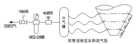 該流化器裝于物料易架橋的料倉內(nèi)壁,通過外接的壓縮空氣分流在皮碗周圍,